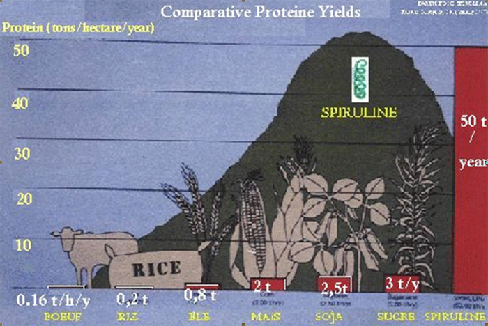 Food Micro-alga Spirulina is capable of a production of 50 tons of proteins per hectare per year and it means 250 -265 times more than beef proteins, 230 times more than rice and 30 times more than soja, consuming 50 times less water than cattle.